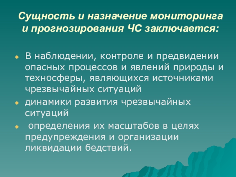 Слайд 2Сущность и назначение мониторинга и прогнозирования ЧС заключается: