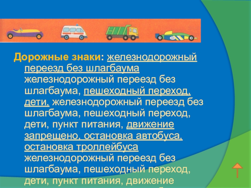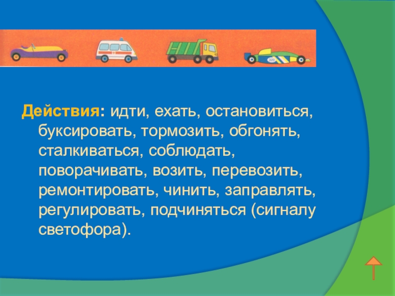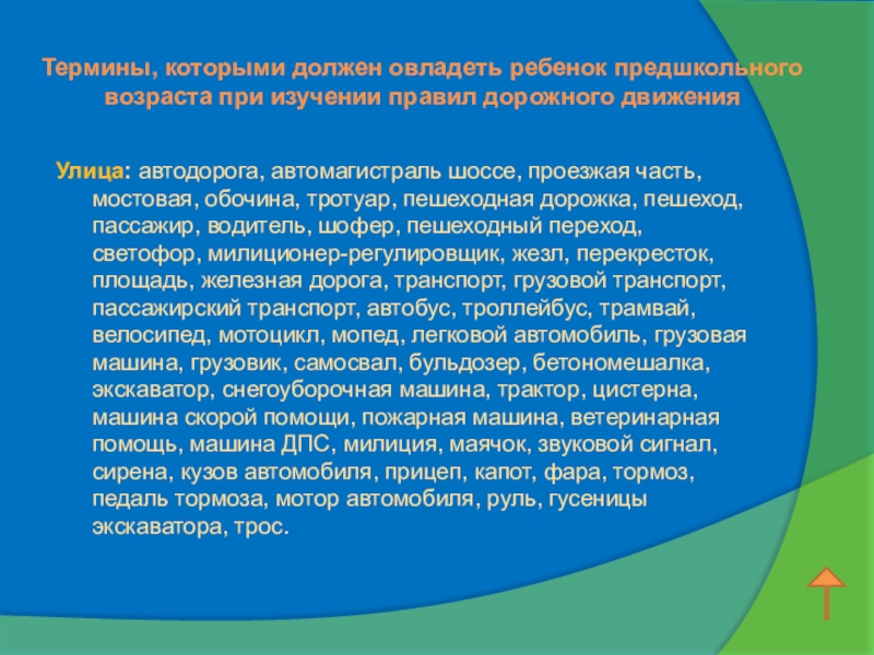 Улица: автодорога, автомагистраль шоссе, проезжая часть, мостовая, обочина, тротуар, пешеходная дорожка, пешеход, пассажир, водитель, шофер, пешеходный переход, светофор, милиционер-регулировщик, жезл, перекресток, площадь, железная дорога, транспорт, грузовой транспорт, пассажирский транспорт, автобус, троллейбус, трамвай, велосипед, мотоцикл, мопед, легковой автомобиль, грузовая машина, грузовик, самосвал, бульдозер, бетономешалка, экскаватор, снегоуборочная машина, трактор, цистерна, машина скорой помощи, пожарная машина, ветеринарная помощь, машина ДПС, милиция, маячок, звуковой сигнал, сирена, кузов автомобиля, прицеп, капот, фара, тормоз, педаль тормоза, мотор автомобиля, руль, гусеницы экскаватора, трос.