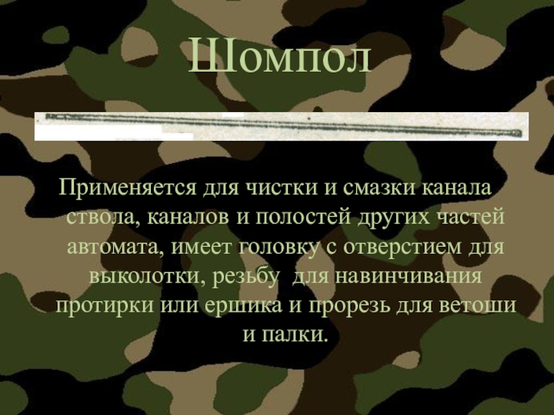 частей автомата, имеет головку с отверстием для выколотки, резьбу для навинчивания протирки или ершика и прорезь для ветоши и палки.