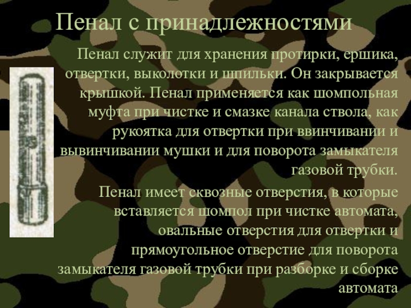 и шпильки. Он закрывается крышкой. Пенал применяется как шомпольная муфта при чистке и смазке канала ствола, как рукоятка для отвертки при ввинчивании и вывинчивании мушки и для поворота замыкателя газовой трубки.