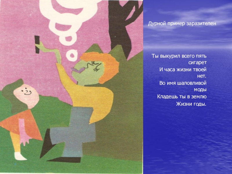Дурной пример заразителенТы выкурил всего пять сигаретИ часа жизни твоей нет.Во имя шаловливой модыКладешь ты в землю