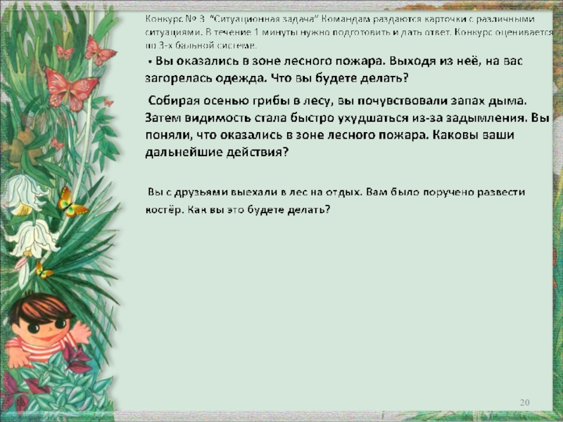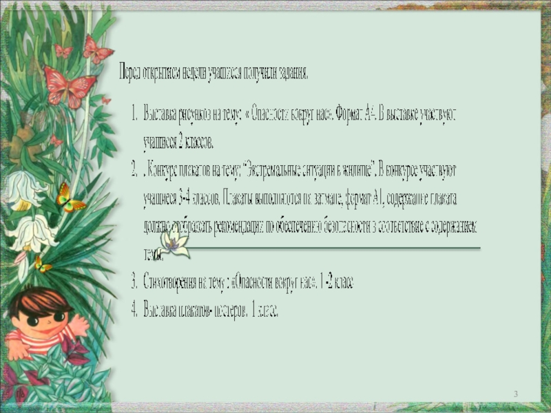 1. Конкурс плакатов на тему: “Экстремальные ситуации в жилище”. В конкурсе участвуют учащиеся 3-4 классов. Плакаты выполняются на ватмане, формат А1, содержание плаката должно отображать рекомендации по обеспечению безопасности в соответствие с содержанием темы.