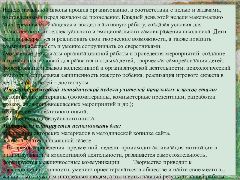 Слайд 31Неделя начальной школы прошла организованно, в соответствии с целью и задачами,