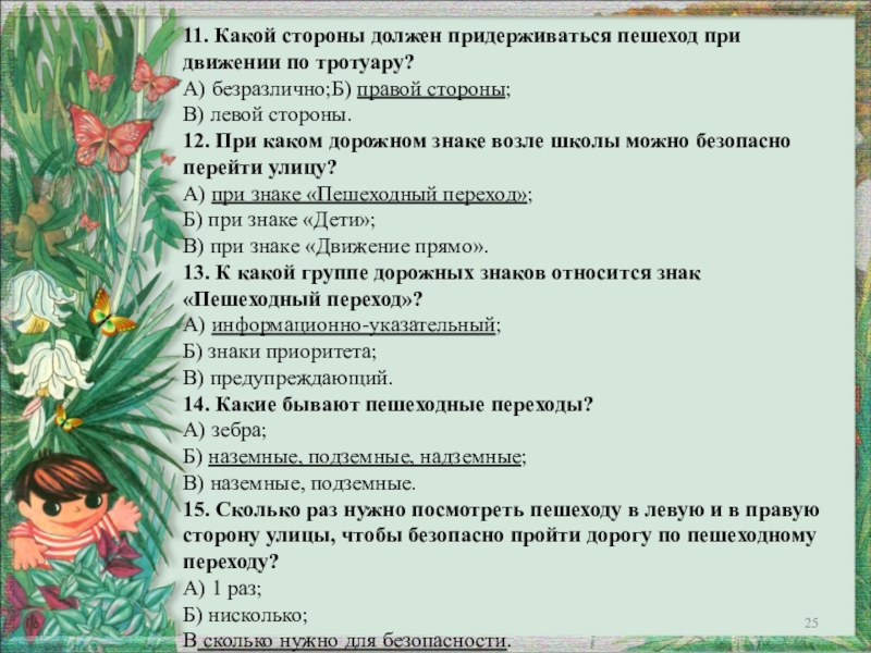 Слайд 2511. Какой стороны должен придерживаться пешеход при движении по тротуару?