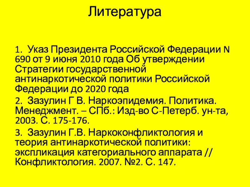 2. Зазулин Г В. Наркоэпидемия. Политика. Менеджмент. – СПб.: Изд-во С-Петерб. ун-та, 2003. С. 175-176.