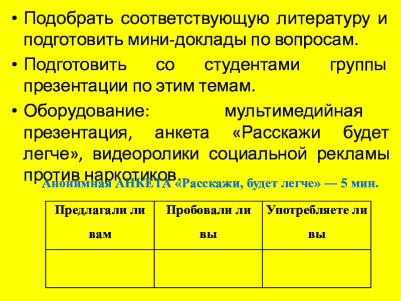 Оборудование: мультимедийная презентация, анкета «Расскажи будет легче», видеоролики социальной рекламы против наркотиков.