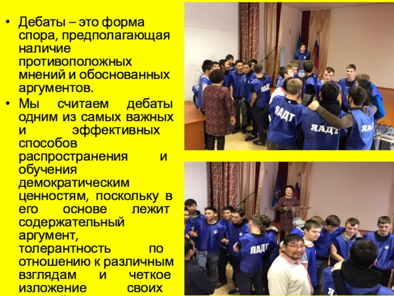 Мы считаем дебаты одним из самых важных и эффективных способов распространения и обучения демократическим ценностям, поскольку в его основе лежит содержательный аргумент, толерантность по отношению к различным взглядам и четкое изложение своих мыслей.