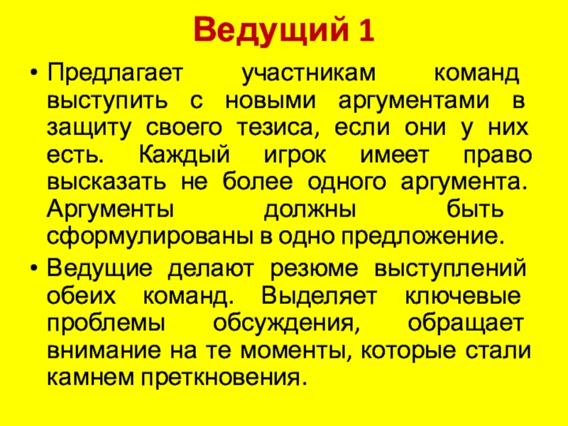 своего тезиса, если они у них есть. Каждый игрок имеет право высказать не более одного аргумента. Аргументы должны быть сформулированы в одно предложение.