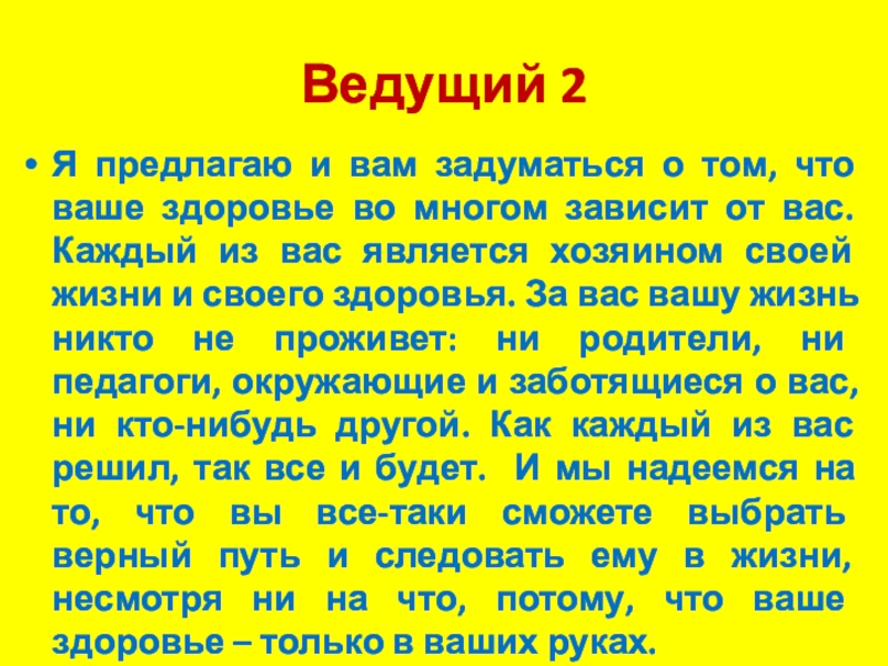 во многом зависит от вас. Каждый из вас является хозяином своей жизни и своего здоровья. За вас вашу жизнь никто не проживет: ни родители, ни педагоги, окружающие и заботящиеся о вас, ни кто-нибудь другой. Как каждый из вас решил, так все и будет. И мы надеемся на то, что вы все-таки сможете выбрать верный путь и следовать ему в жизни, несмотря ни на что, потому, что ваше здоровье – только в ваших руках.