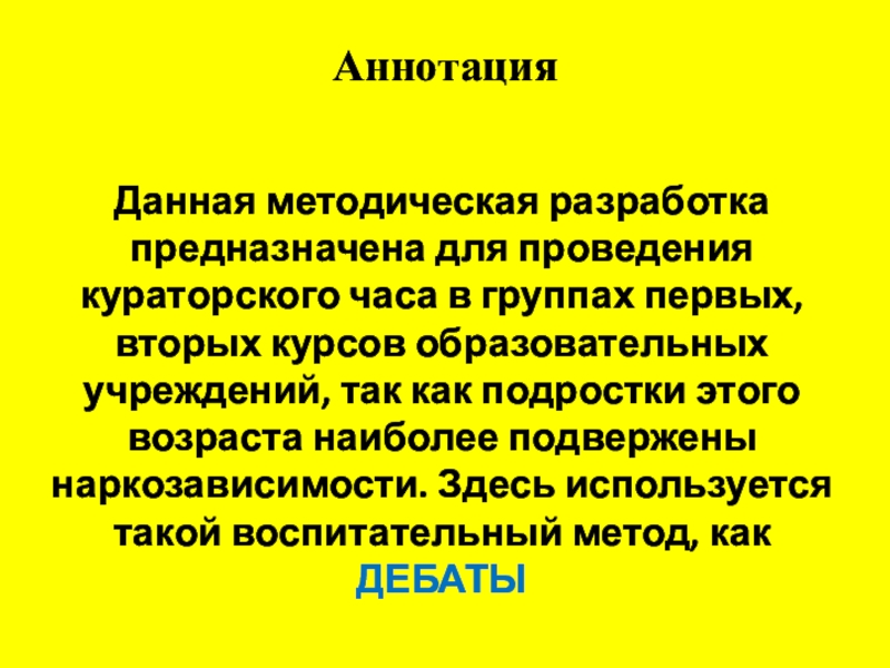 первых, вторых курсов образовательных учреждений, так как подростки этого возраста наиболее подвержены наркозависимости. Здесь используется такой воспитательный метод, как ДЕБАТЫ