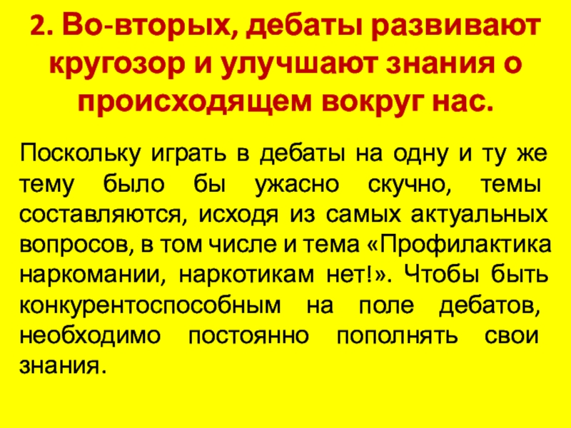 Слайд 52. Во-вторых, дебаты развивают кругозор и улучшают знания о происходящем вокруг