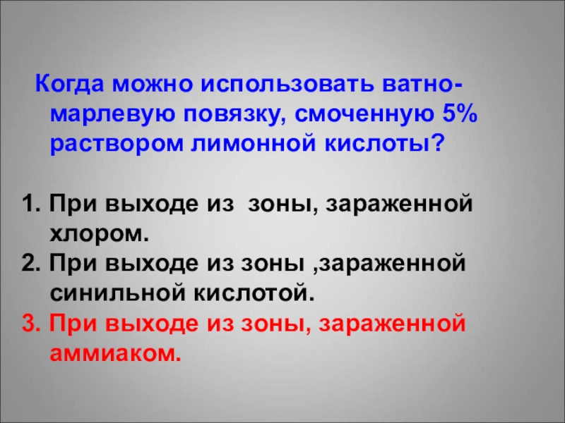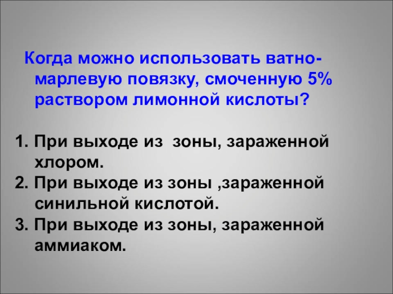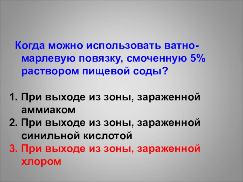 Для защиты от хлора ВМП смочите 2-5%-ном растворе пищевой соды, от аммиака 2%-ном растворе лимонной или уксусной кислоты.