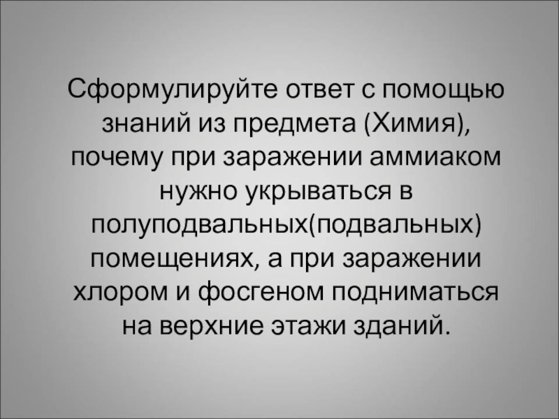 Наденьте противогаз, а при его отсутствии – ватномарлевую повязку или подручные изделия из ткани, смоченные в воде, 2-5% растворе пищевой соды (для защиты от хлора), лимонной или уксусной кислоты (для защиты от аммиака)