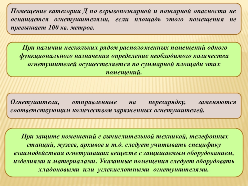 При защите помещений с вычислительной техникой, телефонных станций, музеев, архивов и т.д. следует учитывать специфику взаимодействия огнетушащих веществ с защищаемым оборудованием, изделиями и материалами. Указанные помещения следует оборудовать хладоновыми или углекислотными огнетушителями.