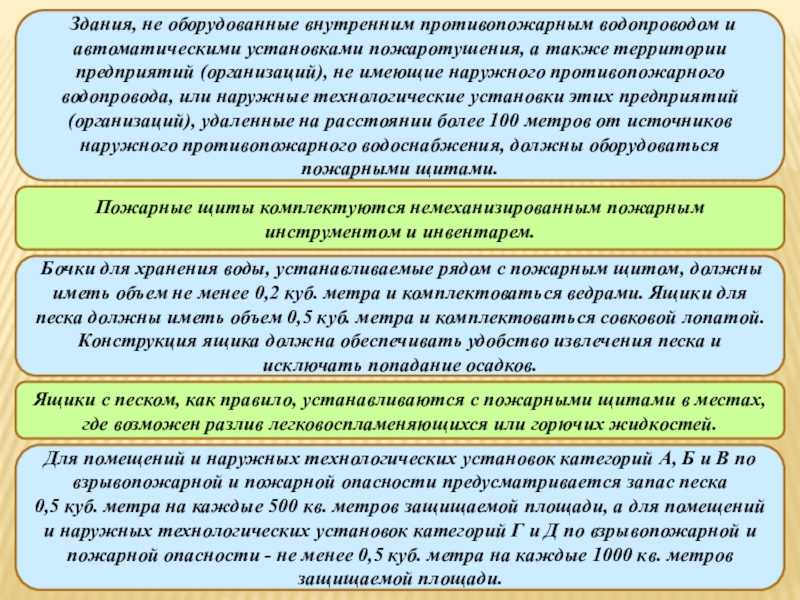 Здания, не оборудованные внутренним противопожарным водопроводом и автоматическими установками пожаротушения, а также территории предприятий (организаций), не имеющие наружного противопожарного водопровода, или наружные технологические установки этих предприятий (организаций), удаленные на расстоянии более 100 метров от источников наружного противопожарного водоснабжения, должны оборудоваться пожарными щитами.