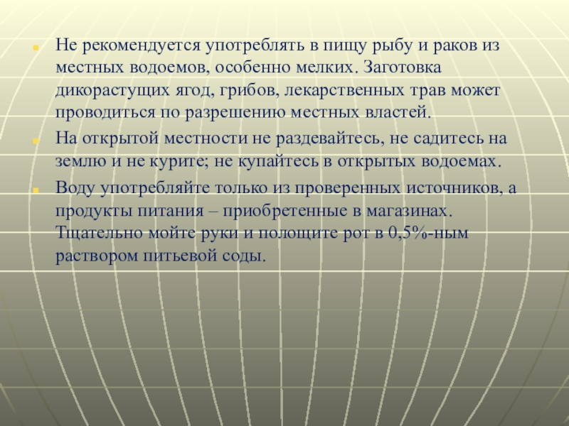 Слайд 17Не рекомендуется употреблять в пищу рыбу и раков из местных водоемов,
