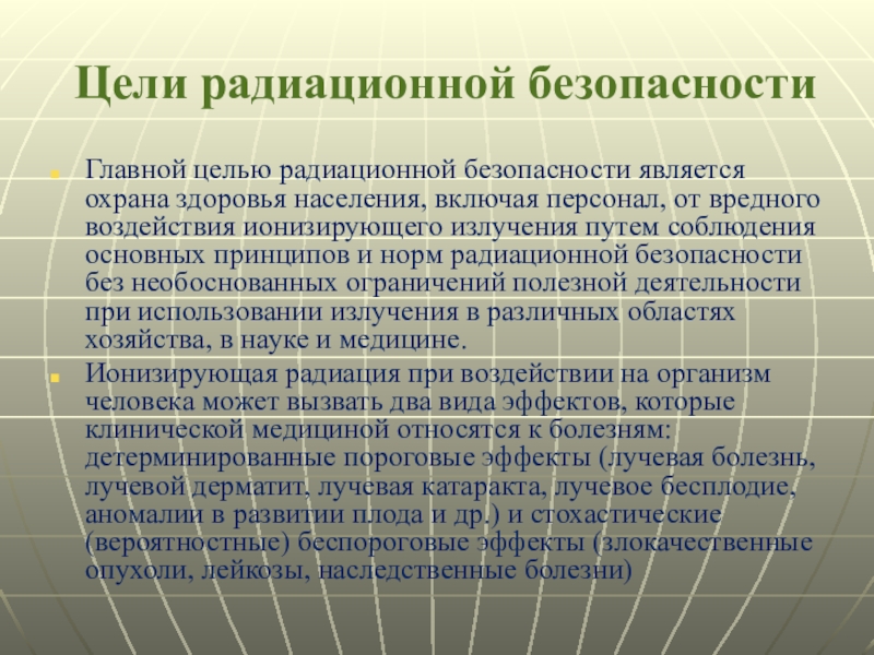 Главной целью радиационной безопасности является охрана здоровья населения, включая