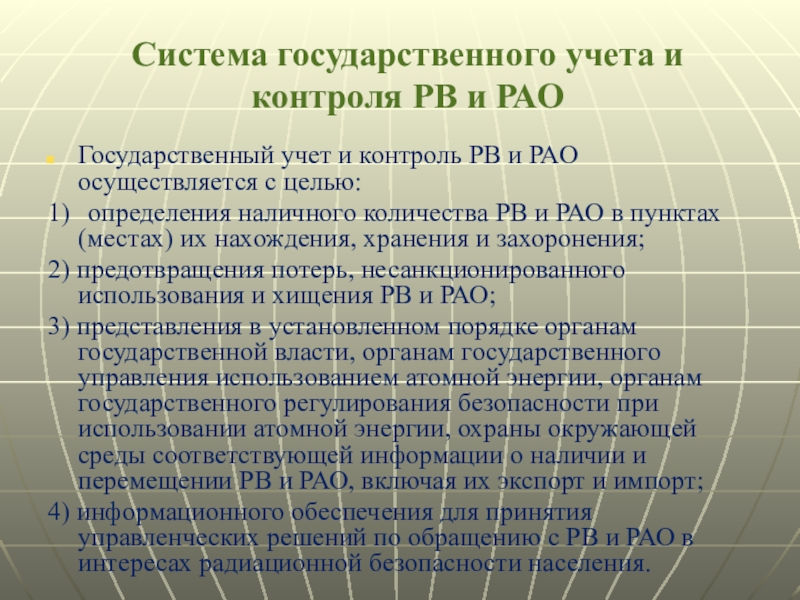 3) представления в установленном порядке органам государственной власти, органам государственного управления использованием атомной энергии, органам государственного регулирования безопасности при использовании атомной энергии, охраны окружающей среды соответствующей информации о наличии и перемещении РВ и РАО, включая их экспорт и импорт;