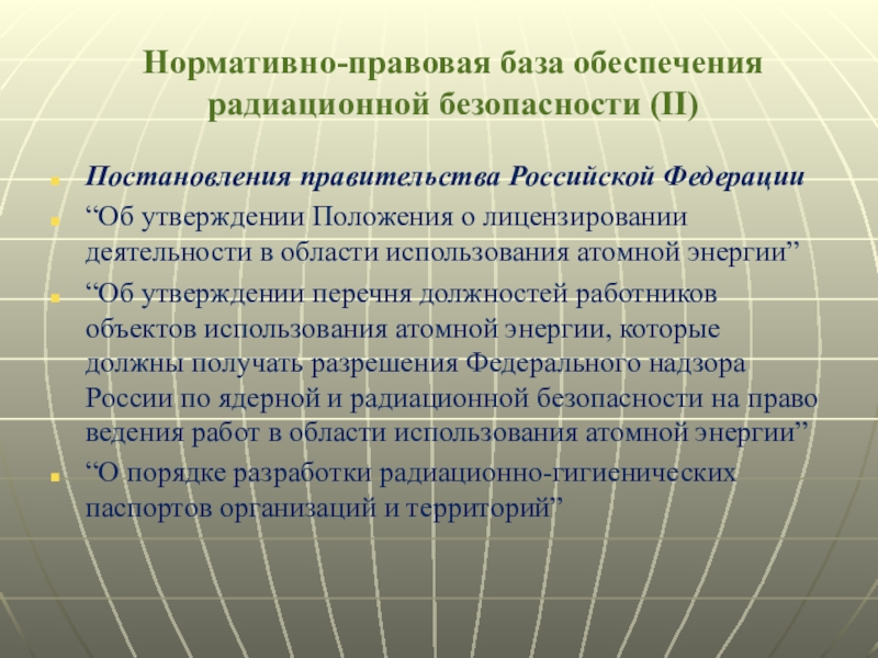 Слайд 6Нормативно-правовая база обеспечения радиационной безопасности (II)