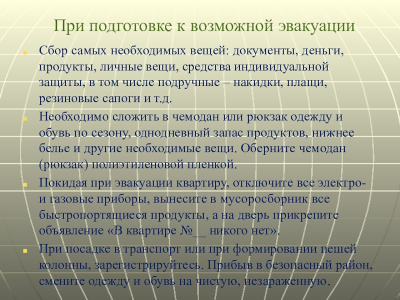 При посадке в транспорт или при формировании пешей колонны, зарегистрируйтесь. Прибыв в безопасный район, смените одежду и обувь на чистую, незараженную.