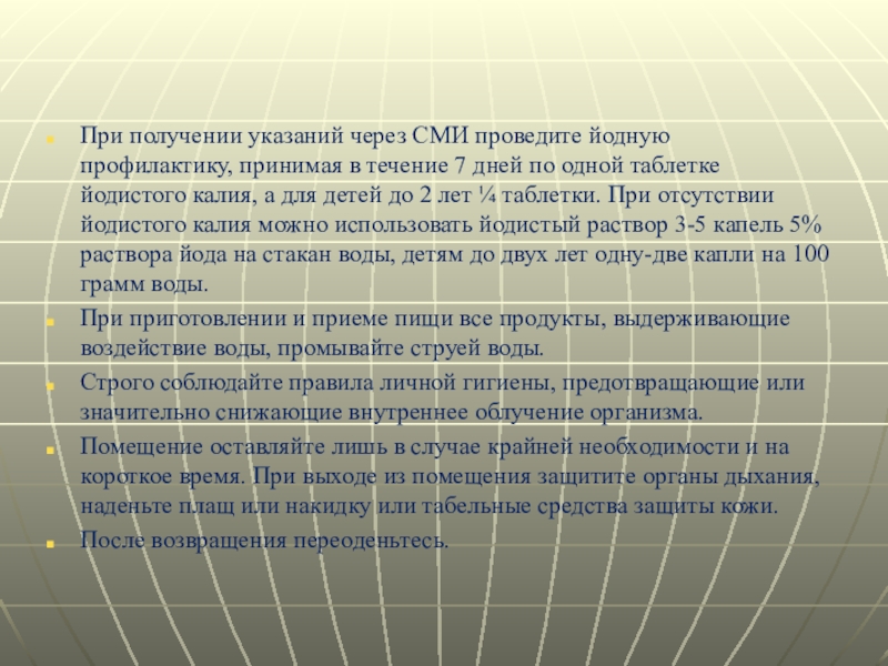 Слайд 13При получении указаний через СМИ проведите йодную профилактику, принимая в течение