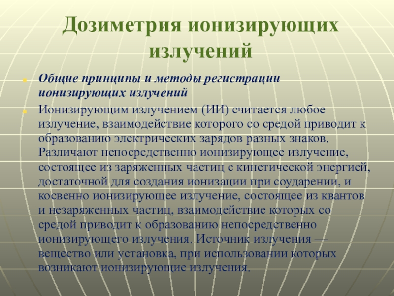 считается любое излучение, взаимодействие которого со средой приводит к образованию электрических зарядов разных знаков. Различают непосредственно ионизирующее излучение, состоящее из заряженных частиц с кинетической энергией, достаточной для создания ионизации при соударении, и косвенно ионизирующее излучение, состоящее из квантов и незаряженных частиц, взаимодействие которых со средой приводит к образованию непосредственно ионизирующего излучения. Источник излучения — вещество или установка, при использовании которых возникают ионизирующие излучения.