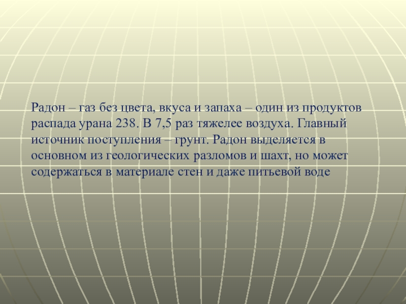продуктов распада урана 238. В 7,5 раз тяжелее воздуха. Главный источник поступления – грунт. Радон выделяется в основном из геологических разломов и шахт, но может содержаться в материале стен и даже питьевой воде