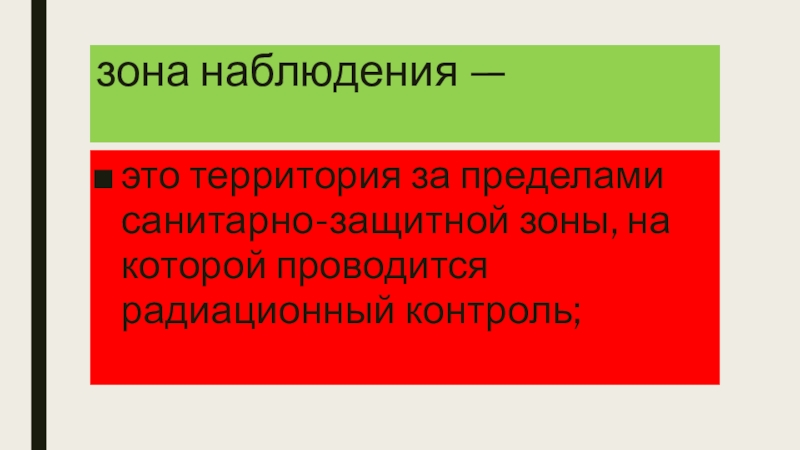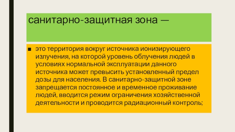облучения людей в условиях нормальной эксплуатации данного источника может превысить установленный предел дозы для населения. В санитарно-защитной зоне запрещается постоянное и временное проживание людей, вводится режим ограничения хозяйственной деятельности и проводится радиационный контроль;