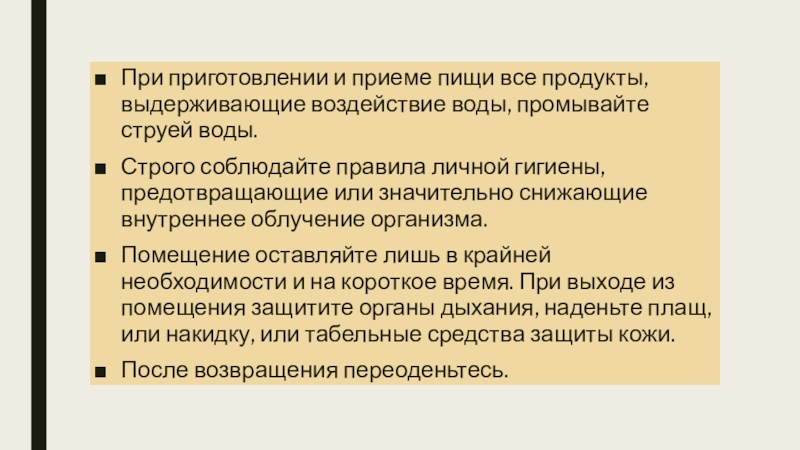 Строго соблюдайте правила личной гигиены, предотвращающие или значительно снижающие внутреннее облучение организма.
