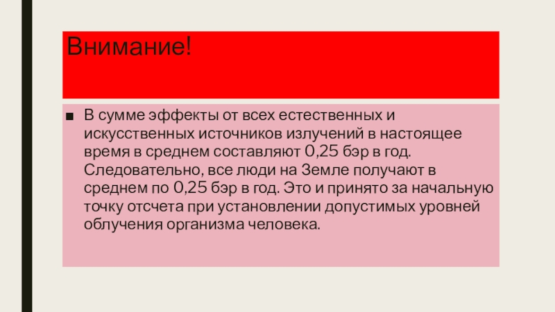 настоящее время в среднем составляют 0,25 бэр в год. Следовательно, все люди на Земле получают в среднем по 0,25 бэр в год. Это и принято за начальную точку отсчета при установлении допустимых уровней облучения организма человека.