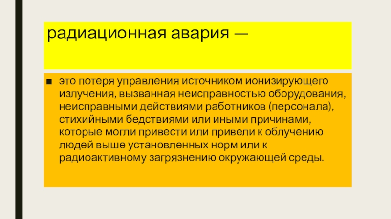оборудования, неисправными действиями работников (персонала), стихийными бедствиями или иными причинами, которые могли привести или привели к облучению людей выше установленных норм или к радиоактивному загрязнению окружающей среды.