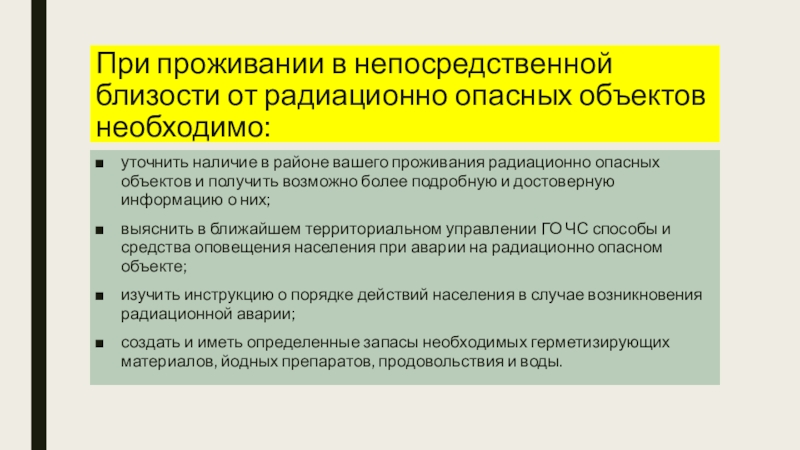 Слайд 16При проживании в непосредственной близости от радиационно опасных объектов необходимо: