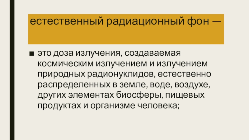 природных радионуклидов, естественно распределенных в земле, воде, воздухе, других элементах биосферы, пищевых продуктах и организме человека;