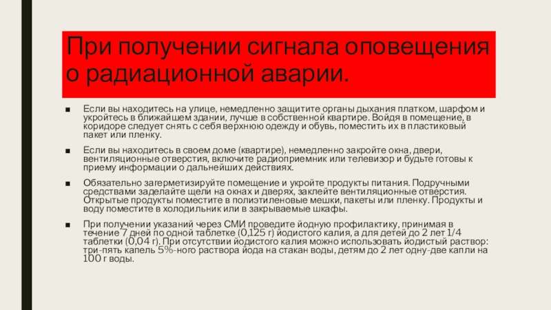 Слайд 17При получении сигнала оповещения о радиационной аварии.
