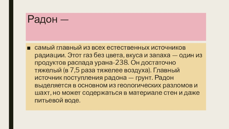 цвета, вкуса и запаха — один из продуктов распада урана-238. Он достаточно тяжелый (в 7,5 раза тяжелее воздуха). Главный источник поступления радона — грунт. Радон выделяется в основном из геологических разломов и шахт, но может содержаться в материале стен и даже питьевой воде.