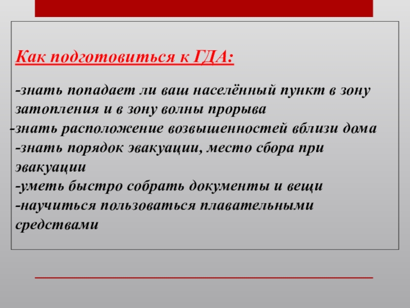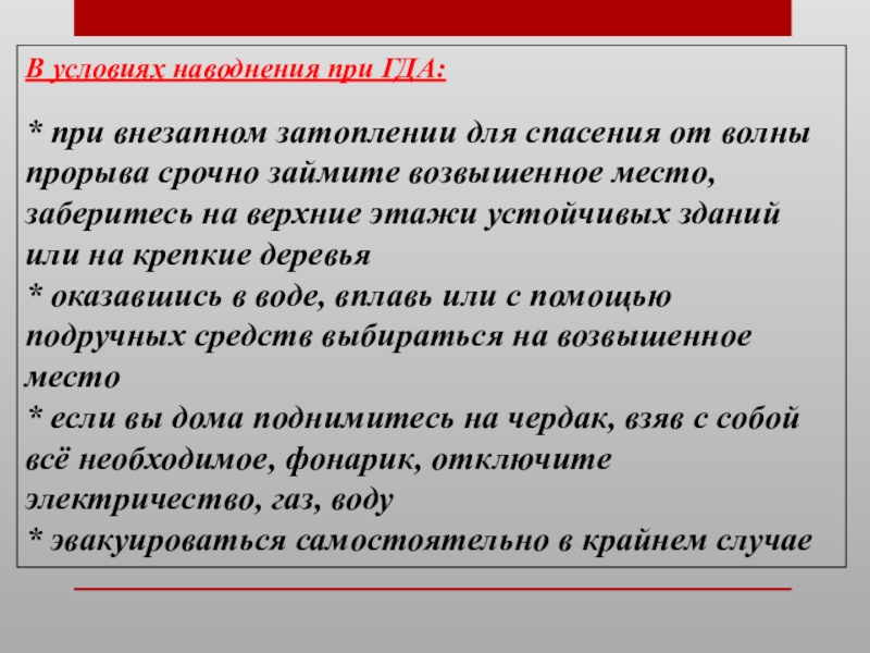 волны прорыва срочно займите возвышенное место, заберитесь на верхние этажи устойчивых зданий или на крепкие деревья