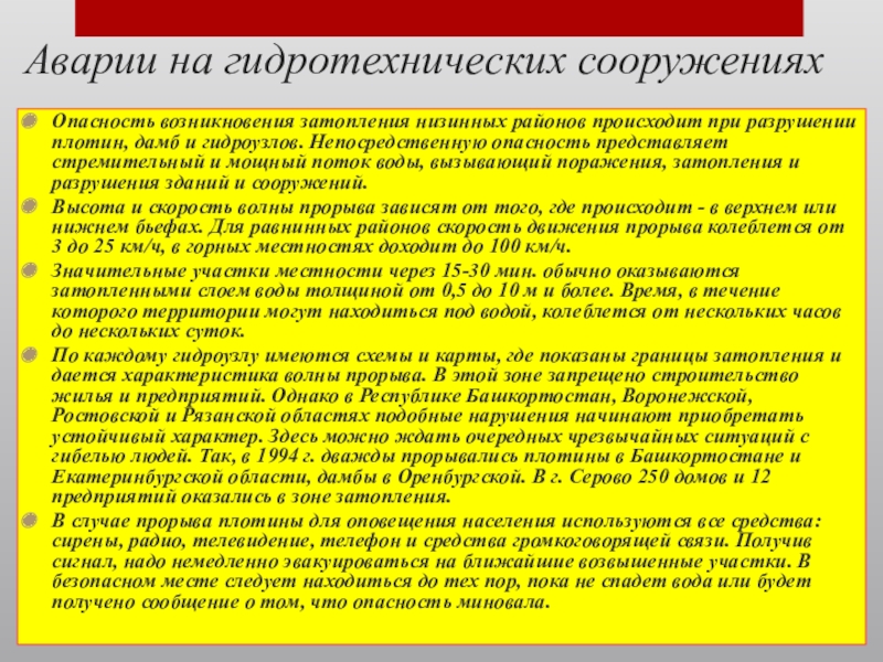 По каждому гидроузлу имеются схемы и карты, где показаны границы затопления и дается характеристика волны прорыва. В этой зоне запрещено строительство жилья и предприятий. Однако в Республике Башкортостан, Воронежской, Ростовской и Рязанской областях подобные нарушения начинают приобретать устойчивый характер. Здесь можно ждать очередных чрезвычайных ситуаций с гибелью людей. Так, в 1994 г. дважды прорывались плотины в Башкортостане и Екатеринбургской области, дамбы в Оренбургской. В г. Серово 250 домов и 12 предприятий оказались в зоне затопления.