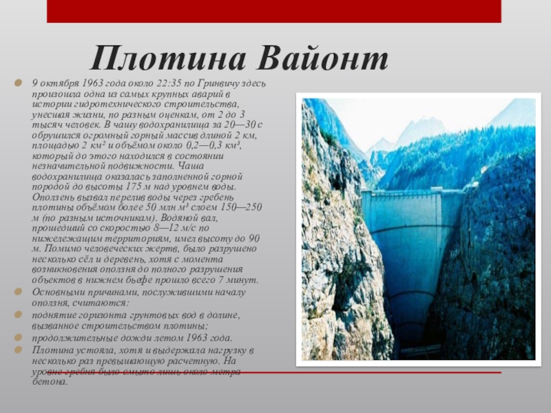 плотин, дамб и гидроузлов. Непосредственную опасность представляет стремительный и мощный поток воды, вызывающий поражения, затопления и разрушения зданий и сооружений.