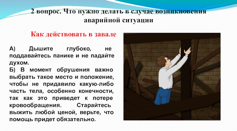 Б) В момент обрушения важно выбрать такое место и положение, чтобы не придавило какую-либо часть тела, особенно конечности, так как это приведет к потере кровообращения. Старайтесь выжить любой ценой, верьте, что помощь придет обязательно.