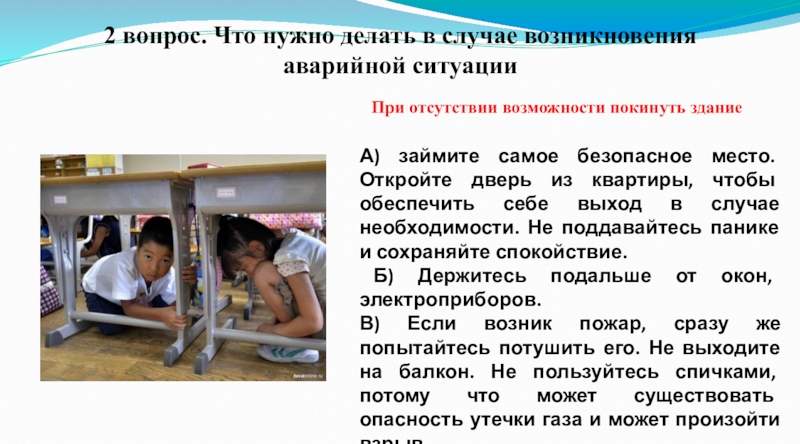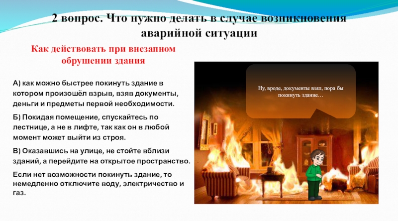 Б) Покидая помещение, спускайтесь по лестнице, а не в лифте, так как он в любой момент может выйти из строя.