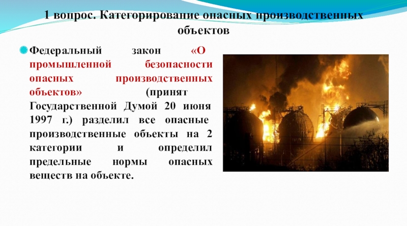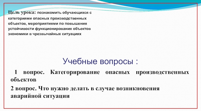 Цель урока: познакомить обучающихся с категориями опасных производственных объектов, мероприятиями по повышения устойчивости функционирования объектов экономики в чрезвычайных ситуациях