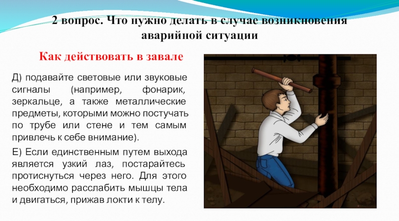 Е) Если единственным путем выхода является узкий лаз, постарайтесь протиснуться через него. Для этого необходимо расслабить мышцы тела и двигаться, прижав локти к телу.