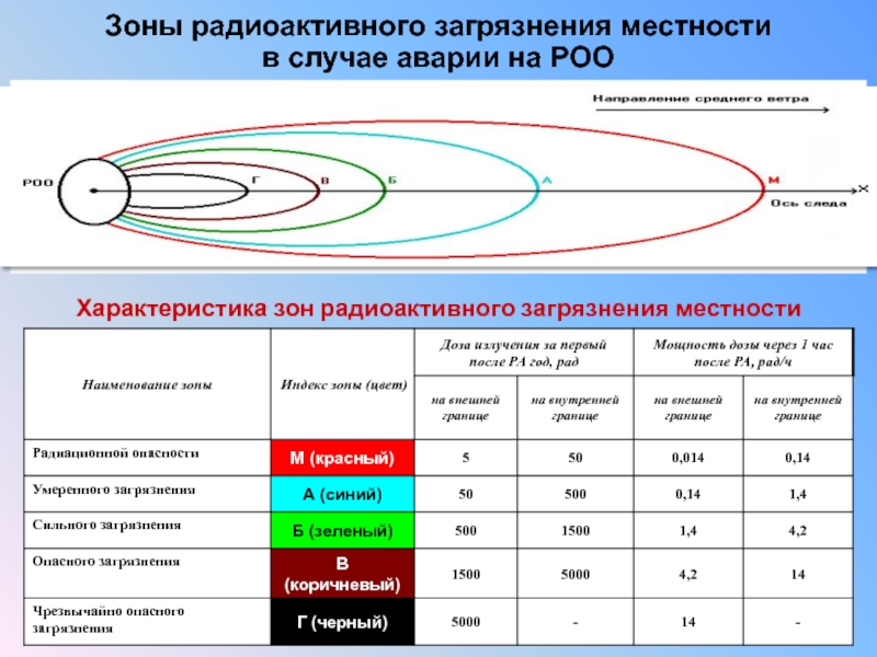 Зоны радиоактивного загрязнения местности  в случае аварии на РОО Характеристика зон радиоактивного загрязнения местности