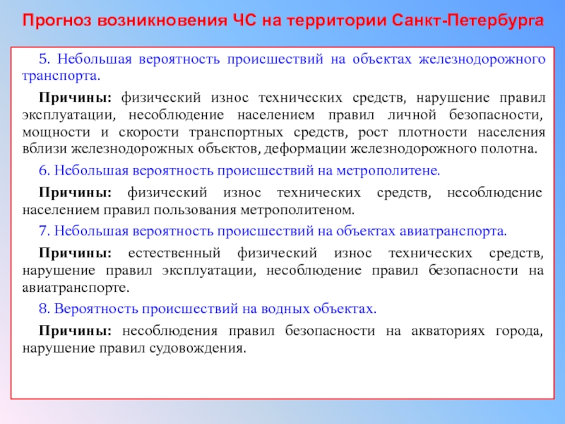 5. Небольшая вероятность происшествий на объектах железнодорожного транспорта.Причины: физический износ технических средств, нарушение правил эксплуатации, несоблюдение населением