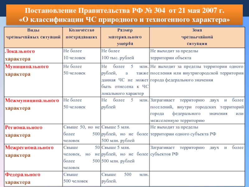 Постановление Правительства РФ № 304 от 21 мая 2007 г. «О классификации ЧС природного и техногенного характера»