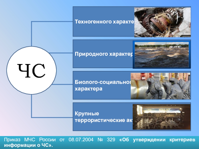 Приказ МЧС России от 08.07.2004 № 329 «Об утверждении критериев информации о ЧС».Техногенного характераПриродного характераБиолого-социального характераКрупныетеррористические актыЧС
