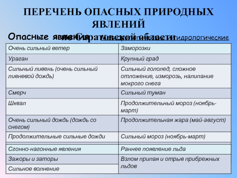 ПЕРЕЧЕНЬ ОПАСНЫХ ПРИРОДНЫХ ЯВЛЕНИЙпо Саратовской областиОпасные явления  Метеорологические и гидрологические