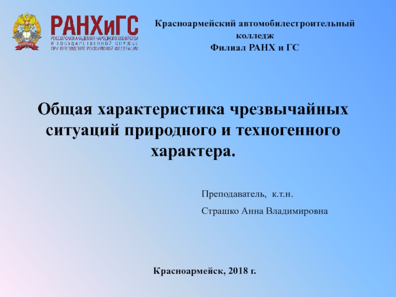 Красноармейский автомобилестроительный колледжФилиал РАНХ и ГСПреподаватель, к.т.н. Страшко Анна Владимировна Красноармейск, 2018 г.Общая характеристика чрезвычайных ситуаций природного