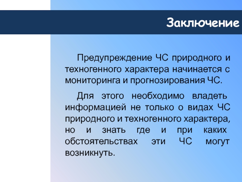 ЗаключениеПредупреждение ЧС природного и техногенного характера начинается с мониторинга и прогнозирования ЧС.Для этого необходимо владеть информацией не