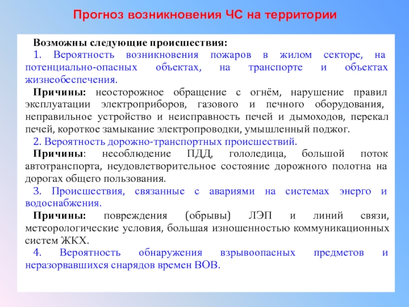 Прогноз возникновения ЧС на территорииВозможны следующие происшествия:1. Вероятность возникновения пожаров в жилом секторе, на потенциально-опасных объектах, на
